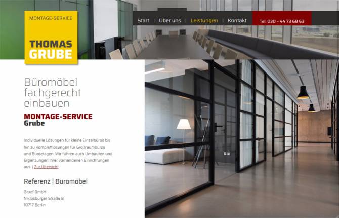 Montageservice Grube in Berlin Treptow-Köpenick bietet die Montage von Küchen, inklusive Küchenplanung; die Montage von Büromöbeln von Einzel- bis Großraumbüro, den Messebau sowie Komplettlösungen für Pflegeheime.