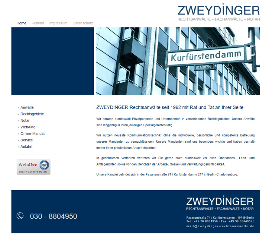 Zweydinger Rechtsanwälte Fachanwälte und Notar haben ihren Sitz nähe Kurfürstendamm in Berlin Wilmersdorf-Charlottenburg. Rechtsgebiete: Arbeitsrecht, Erbrecht, Familienrecht, Grundstücksrecht, Mietrecht, Verkehrsrecht und Vertragsrecht.